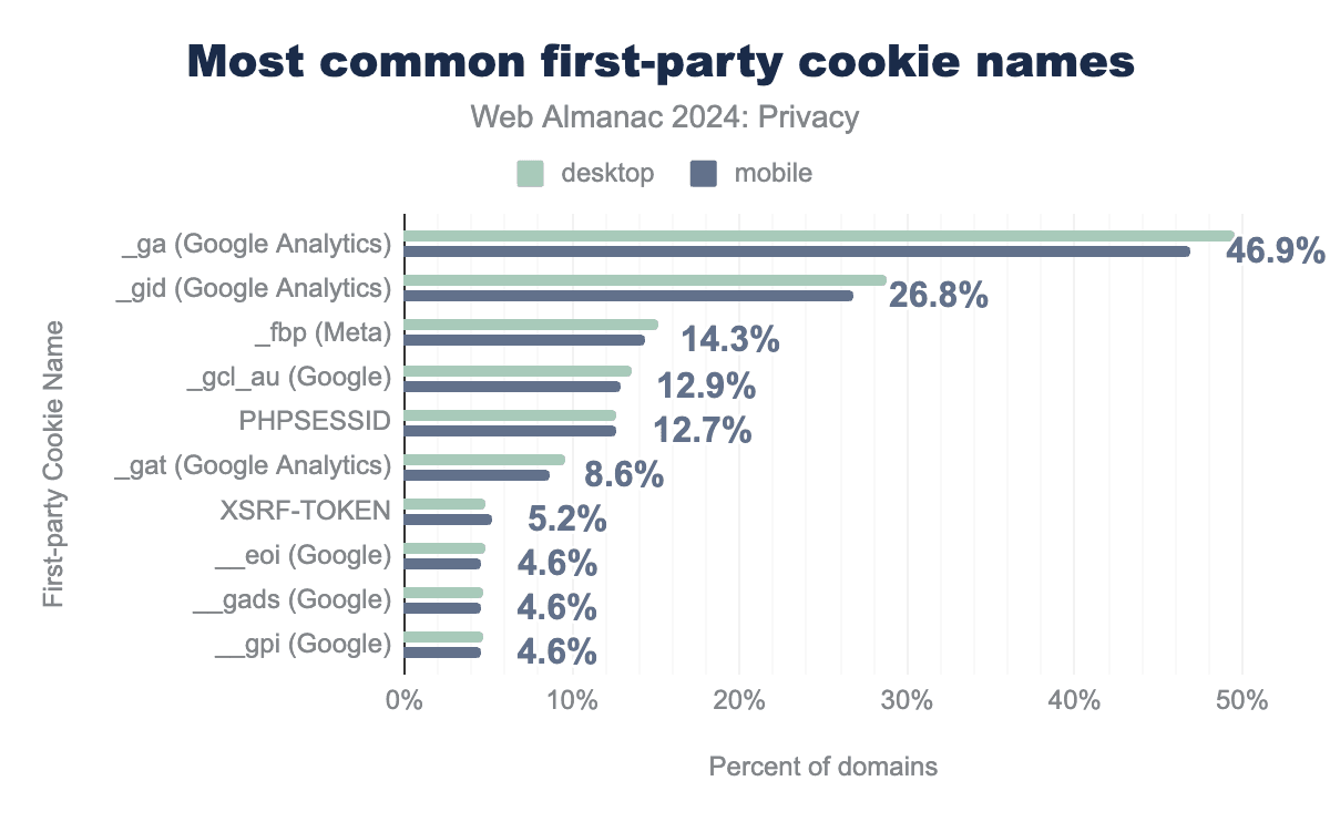 一般的なファーストパーティCookieを測定すると、分析および広告サービスがファーストパーティのコンテキストでCookieを設定している広範な証拠が見られます。上位2つのCookie、_ga_gidは、どちらもGoogle Analyticsの一部です。