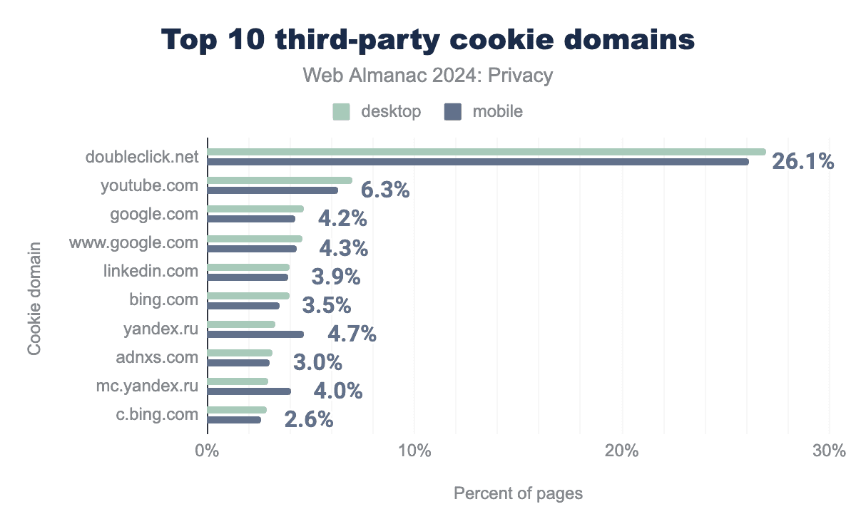 サードパーティCookieは、ウェブ上でユーザーを追跡するために使用される主要なメカニズムです。私たちの測定では、Googleのdoubleclick.comがサードパーティCookieの最大のソースであり、クロールされたウェブページの4分の1以上に存在することが明らかになりました。2022年の分析と比較して、サードパーティCookieのトップソースはほぼ静的なままであり、以前は2番目に大きなサードパーティCookieのソースであったFacebookが著しく欠けています。しかし、次のセクションで示すように、代わりにファーストパーティのコンテキストでFacebookによって設定された多数のCookieが見られます。
