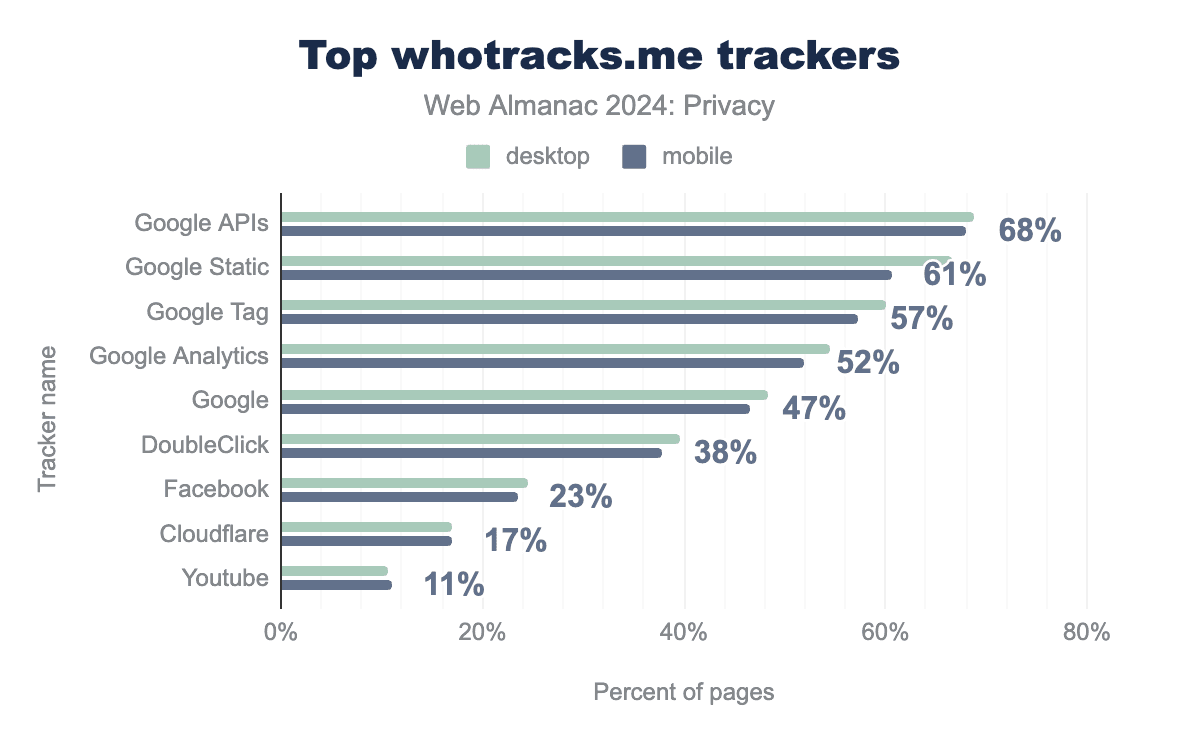Googleが所有するドメインがトラッキング業界を席巻しており、googleapis.comとGoogleのgstatic.comがそれぞれ68%と61%と、もっとも高い割合のページに表示されていることがわかります。その他の著名なトラッカーには、Google TagとGoogle Analyticsがあり、それぞれ50%以上のページで見られ、Googleのトラッキングサービスの広範なリーチを浮き彫りにしています。Googleとその関連サービスに加えて、FacebookとCloudflareの顕著な存在も確認できます。